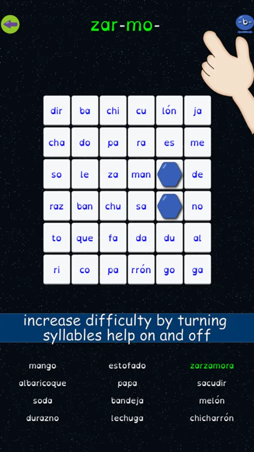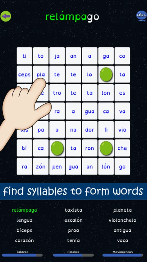 The player must complete a level before proceeding to the next. Levels become more challenging as the player advances through the game: the list of words increases, words are presented by topics, 2 to 6 syllable words are introduced, green cards are no longer available, duplicate syllables are presented on the board, among many other challenges.