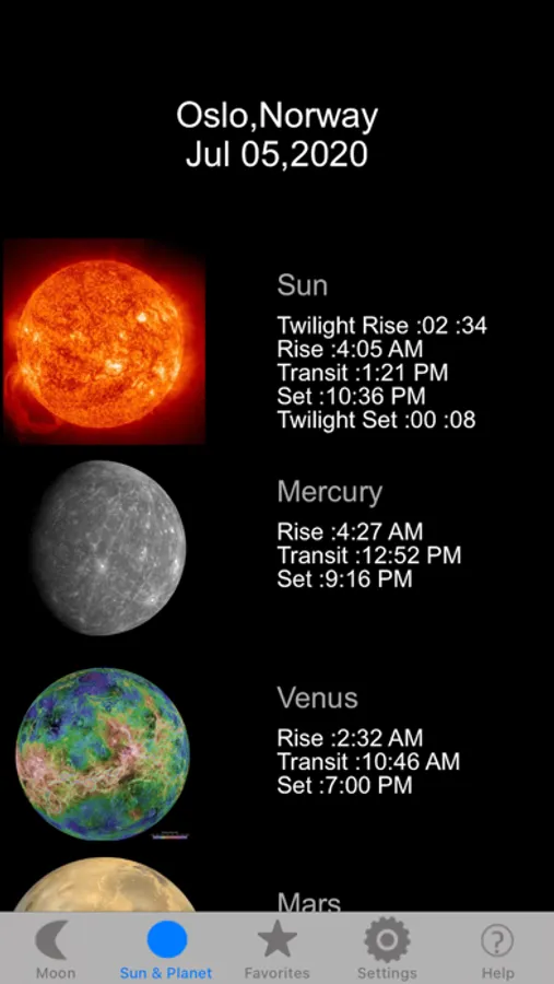 Save your favorite places to view sun and planet and moon rise/set times and moon phases.