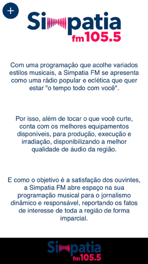 Com uma programação que acolhe variados estilos musicais, a Simpatia FM se apresenta como uma rádio popular e eclética que quer estar 'o tempo todo com você'. Por isso, além de tocar o que você curte, conta com os melhores equipamentos disponíveis, para produção, execução e irradiação, disponibilizando a melhor qualidade de áudio da região. E como o objetivo é a satisfação dos ouvintes, a Simpatia FM abre espaço na sua programação musical para o jornalismo dinâmico e responsável, reportando os fatos de interesse de toda a região de forma imparcial. Focada na interatividade a rádio está disponível nas principais redes sociais como Orkut, Twitter e Facebook. Assim, além de ouvir, você pode curtir, dar sugestões, ficar por dentro das novidades e ajudar a fazer a rádio que está 'o tempo todo com você".