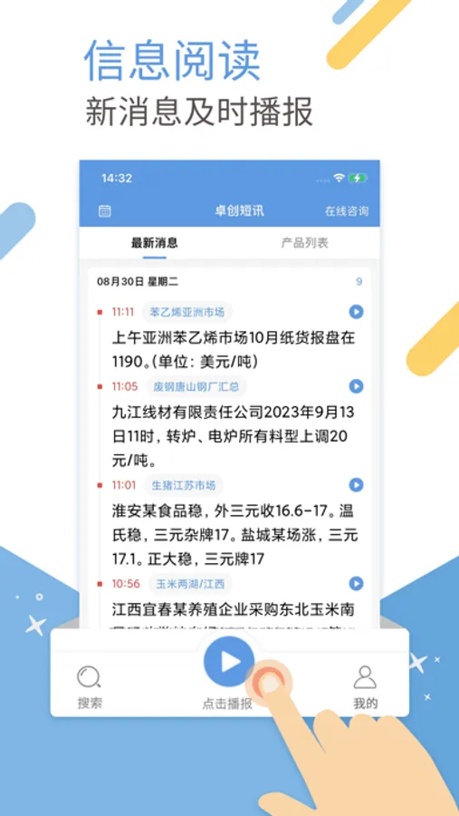 卓创短讯是由卓创资讯推出的一款定制型智能手机客户端产品,面向企业和个人用户,以大宗商品日度价格信息报道为核心,辅助短期交易决策的APP产品;产品主要内容包含企业报价、日度预测、市场价格、供需信息、日度收盘等;具备按需订阅、语音播报、历史信息查看的功能,帮助您及时获得大宗商品市场交易中的短期价格信息,为您提供决策支持。