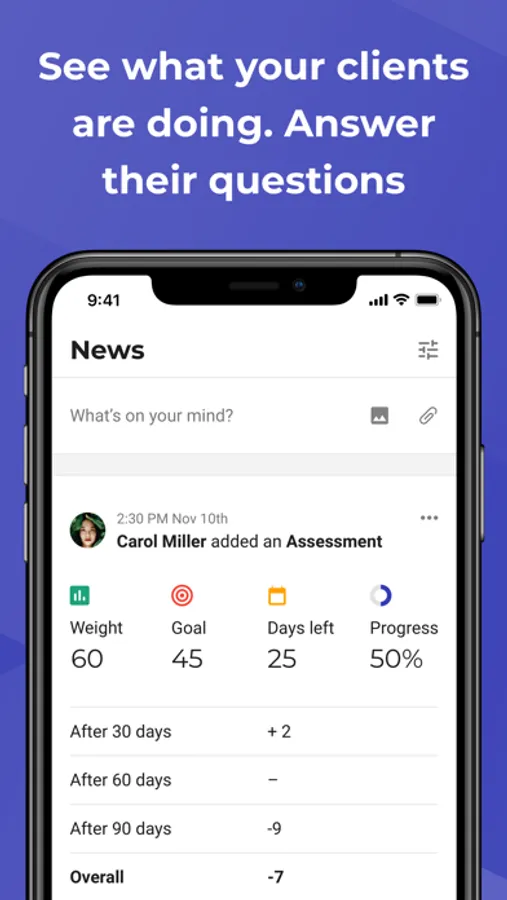 Get rid of follow-up emails. Track real-time progress of all your clients from a single dashboard, and keep them accountable towards achieving their goals.