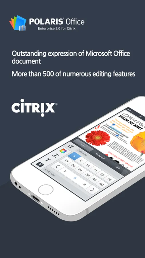 Polaris Office for Citrix is a Mobile Office application that allows Citrix users to view/edit Microsoft Office (Word, Excel and PowerPoint) documents on Smartphone and Tablet. Users can view/edit text files and view .pdf and .hwp files as well. Polaris Office’s excellent rendering quality shows all the texts, charts, pictures and etc. of the documents made with Microsoft Office on a PC as the original itself without any losses. And Polaris Office for Citrix provides powerful editing features and an intuitive interface that allows you to edit document easily. Now, you can safely and conveniently view/edit important documents on your Mobile devices.