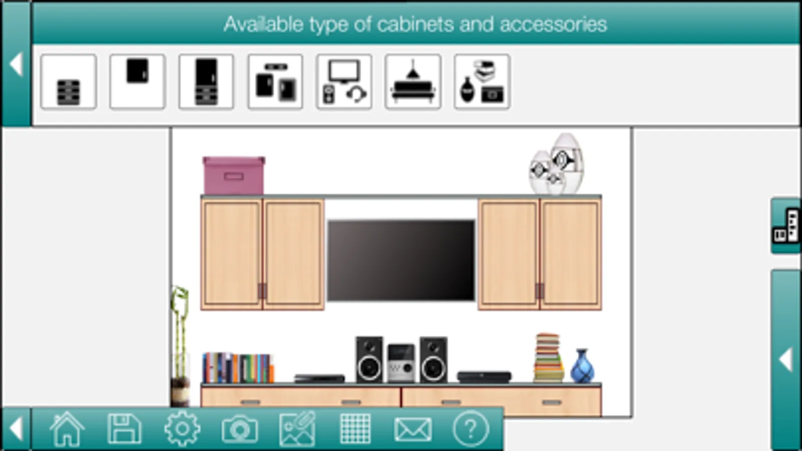 Drag and drop cabinets, furniture and accessories in the design.
