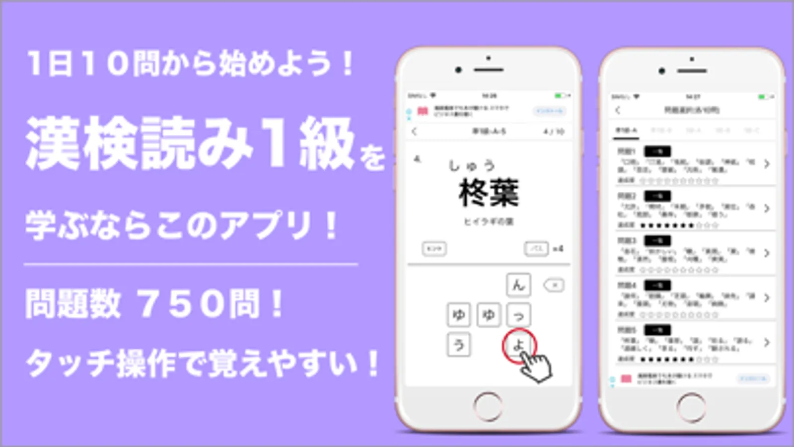 本アプリには漢字検定1級、準1級程度の漢字読み問題を750問を収録しています。