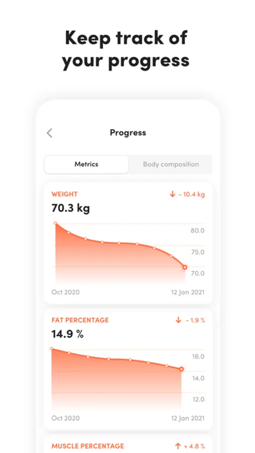 - You get insight in everything: from burned calories to total minutes you exercised, and distance traveled. You can track your progress over time: weight, waist size, BMI, body fat, number of pushups, arm size, chest size, VO2max and many more.