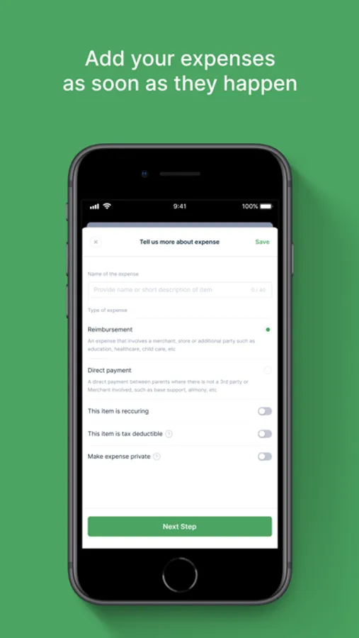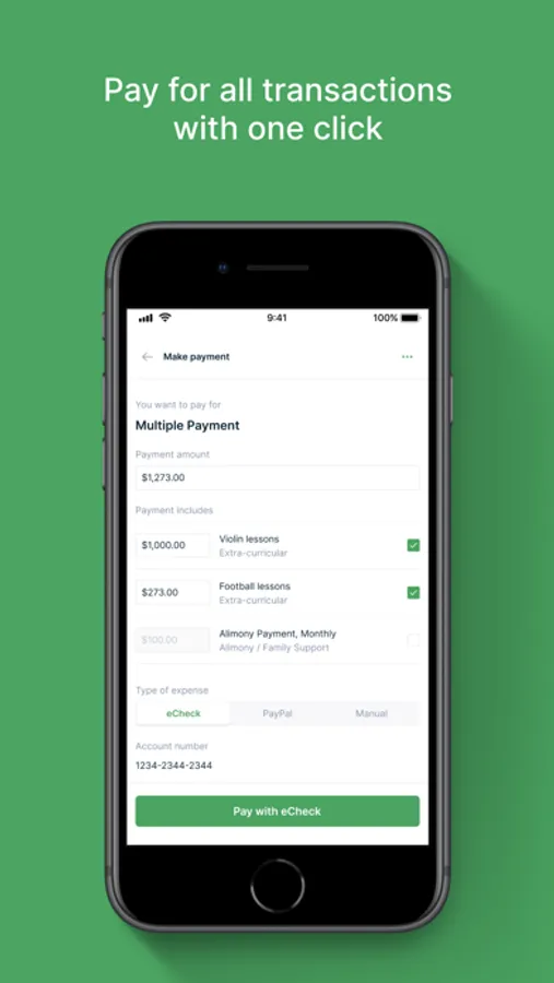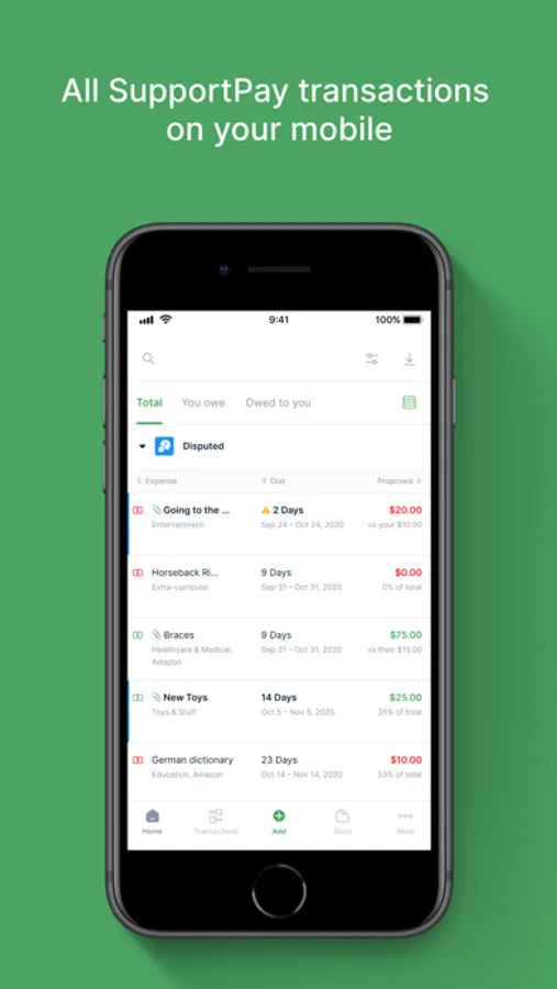 • Use on your own for tracking and certified record-keeping or connect with the other parent for automatic tracking, payments, dispute management, and transparency
