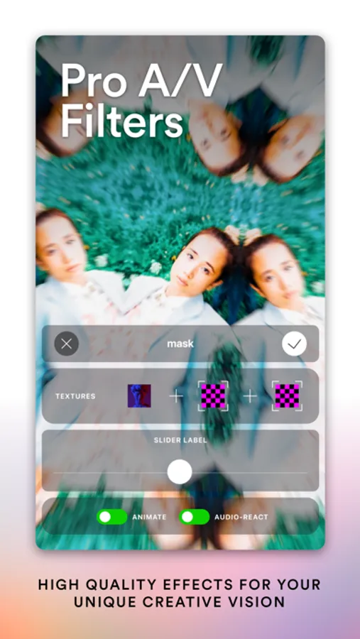 Enjoy free features on us, with creative filter presets, single-clip videos, real-time effects, and audio reactivity built in and ready to roll.