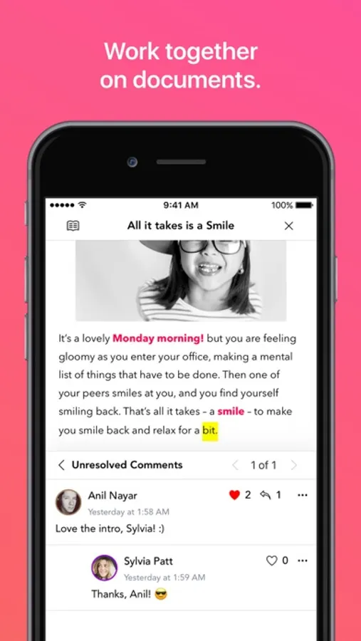 - Join discussions, even when you're away from your desk. Add your thoughts to documents, reply to friends' comments, or just appreciate them by clicking "like."