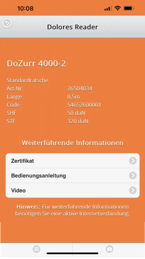 Mit dem kostenlosen Dolores Reader der Firma Dolezych GmbH & Co. KG und des Steinbeis-Forschungszentrums Institut für Transportwesen und Logistik (ITL) Bremerhaven können Sie die Data Matrix Codes auf den Produkten der Firma Dolezych scannen. Neben den Detaildaten erhalten Sie folgende weitere Informationen zum Produkt: