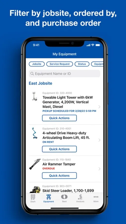 · Manage equipment and tools by jobsite, equipment status and more