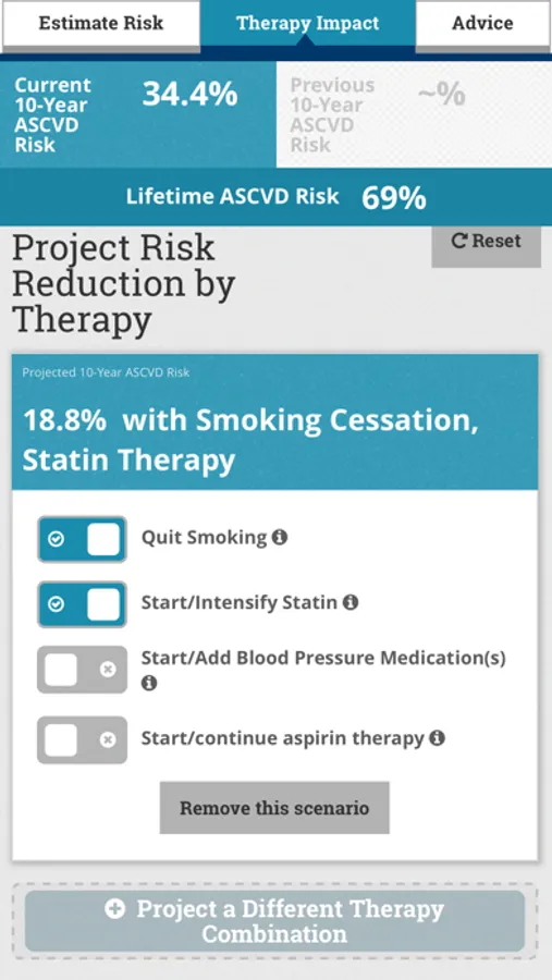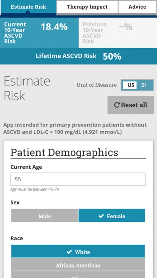 Advice from the app is derived from the 2019 ACC/AHA Guideline on the Primary Prevention of Cardiovascular Disease, the 2018 ACC/AHA et.al Guideline on the Management of Blood Cholesterol, the 2017 ACC/AHA et.al Guideline on High Blood Pressure in Adults, the 2013 ACC/AHA Guideline on the Assessment of Cardiovascular Risk, and the 2016 Million Hearts Longitudinal ASCVD Risk Assessment Tool user guide. The information and recommendations in this app are meant to support clinical decision making. They are not meant to represent the only or best course of care, or replace clinical judgment. Therapeutic options should be determined after discussion between the patient and their care provider.