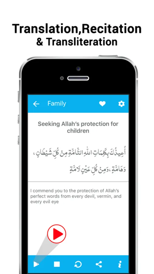 ii) Transliteration: Shows the actual way of pronunciation of Islamic Duas by displaying Arabic transcript in English as it is.