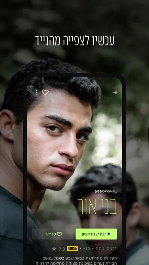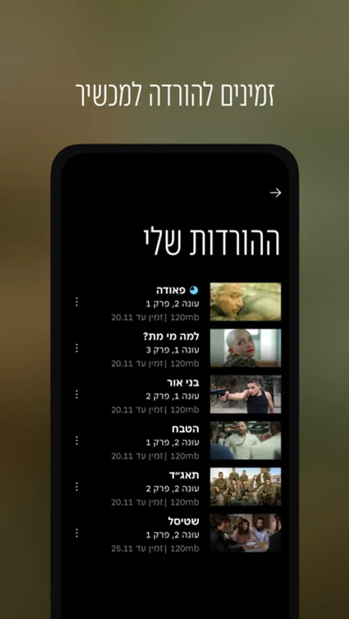הורדת פרקים ישירות למכשיר: אין אינטרנט? אין בעיה. מורידים את התכנים שאוהבים ישירות למכשיר, וצופים בנסיעות ארוכות, בחו״ל ובכל מקום ללא חיבור זמין לרשת