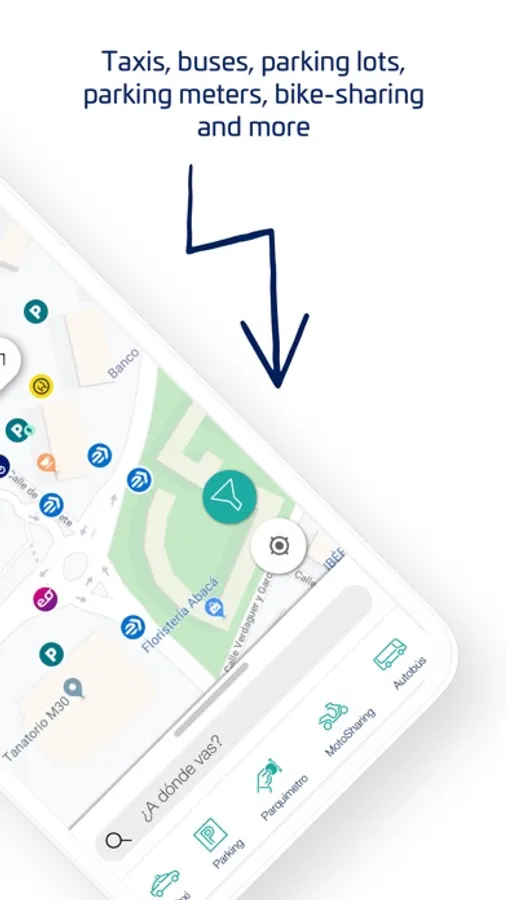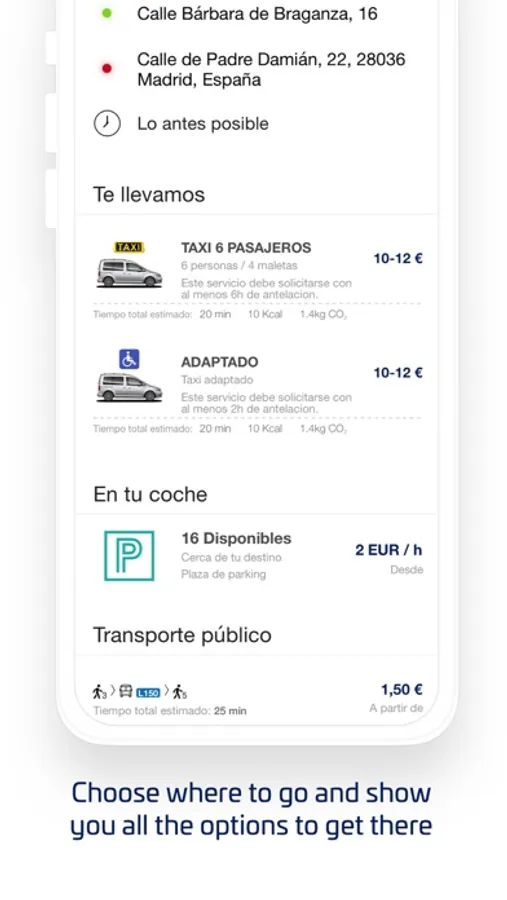 Choose where to go and show you all the possibilities you have to get there: taxi, bus, or even motosharing Compare Prices and availability of parking nearby and blue area if you choose your car.