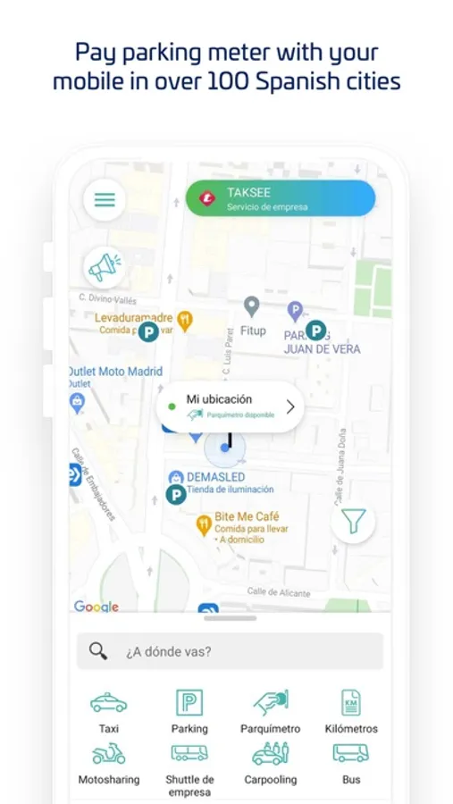 Remove the parking meter ticket from your mobile without cash or cards in more than 100 cities in Spain: Madrid, San Sebastian, Gijon, Barcelona, Toledo, Lleida, Bilbao, Valencia, Malaga ...