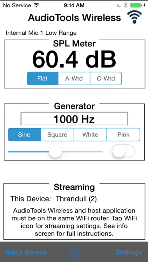 AudioTools Wireless is a pro-caliber SPL Meter, with A and C weighting, and also includes an audio signal generator that can produce sine waves, square waves, and white and pink noise.