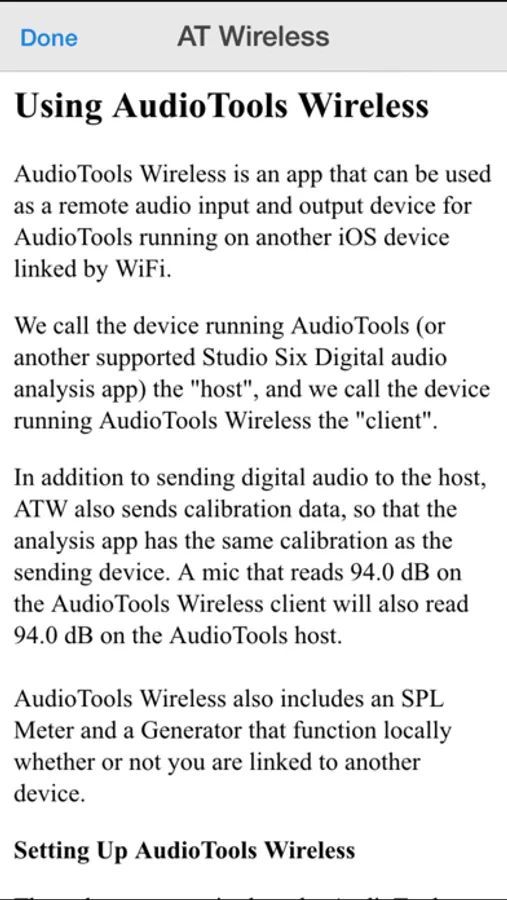 When linked to a Studio Six Digital audio app, AudioTools Wireless can also be used as a remote generator, so that you can control the generator output signal wirelessly.