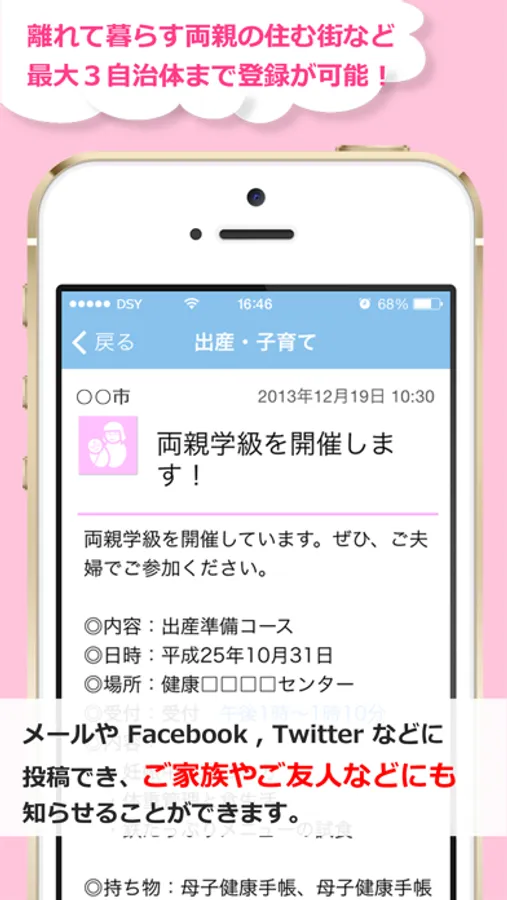 ・受け取った通知は メール や メッセージ 、Facebook 、Twitter などに投稿でき、ご家族やご友人などに知らせる事ができます。