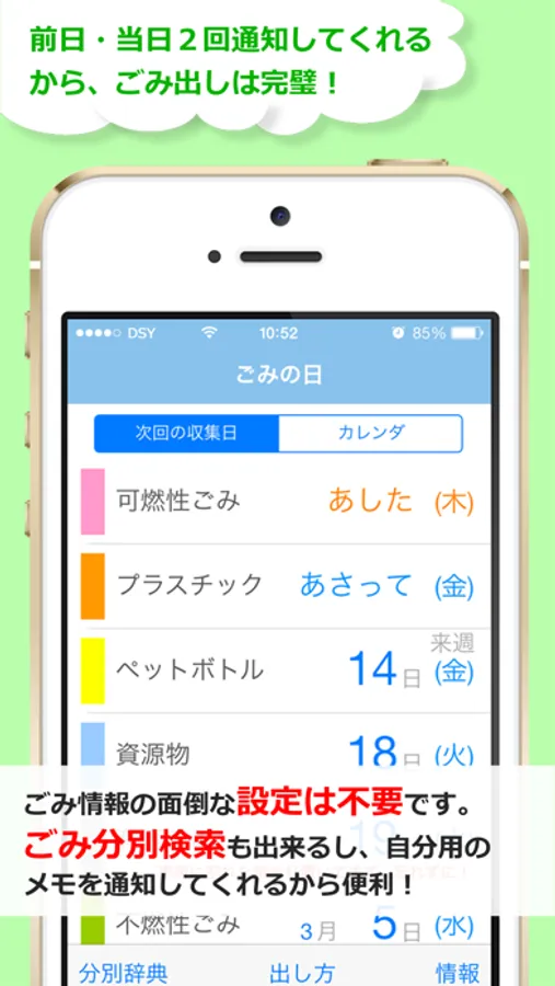 ・カレンダ形式、次回の収集日表示の見やすい表示で、ごみ出しの予定も立てやすくなります。