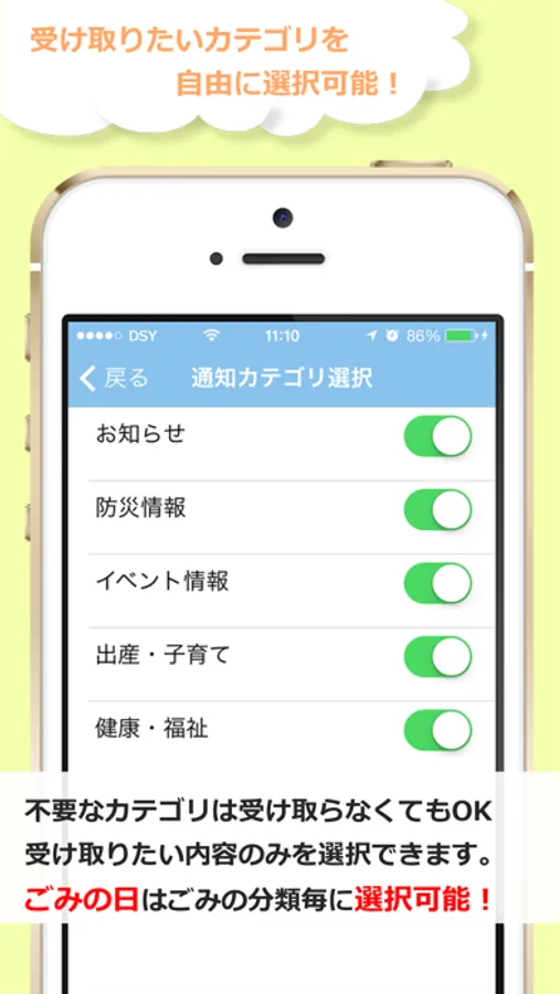 ・お知らせ、イベント、防災などのジャンルから、受け取りたい通知を自由に選択できます。