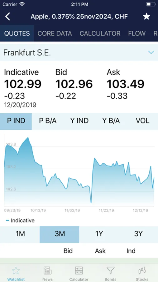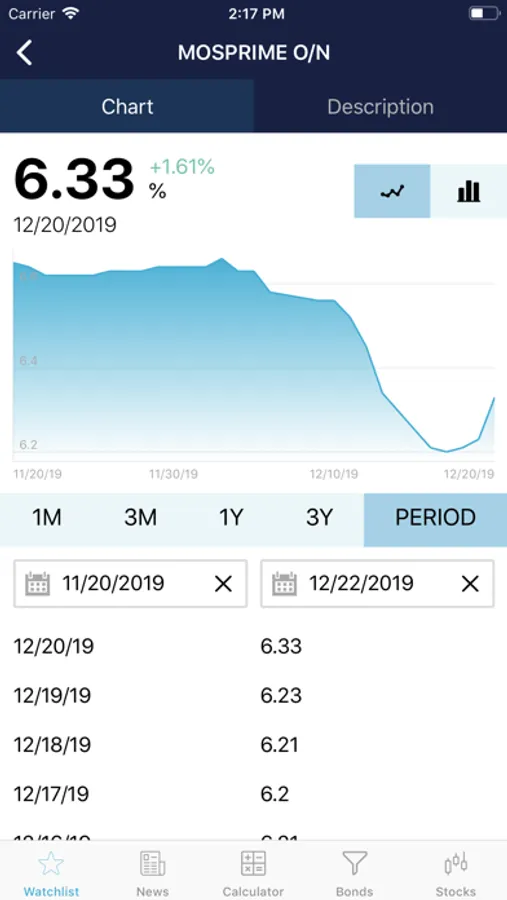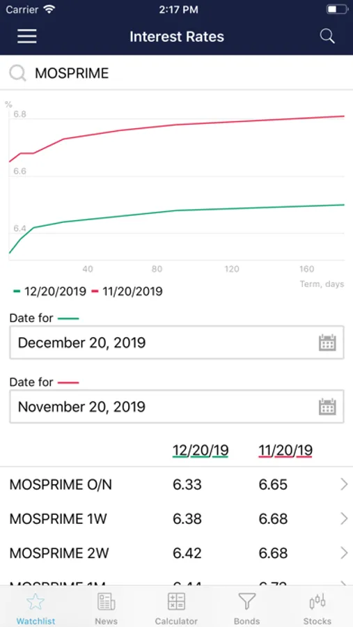The application provides a quick search facility for stocks, bonds and indices, as well as popular analytical tools.