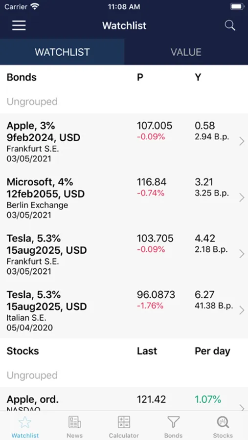 The key functionality of the Watchlist application allows you to track information and quotes on a selected list of bonds, shares and indices. The list is added via a search in the Watchlist section or through the bond, stock, or index pages.
