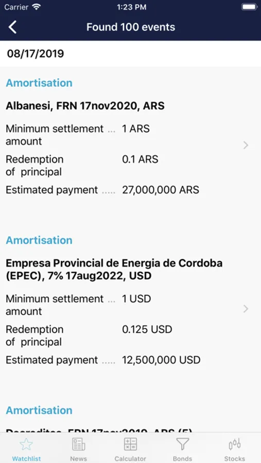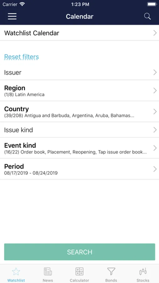 The event calendar allows you to filter bond events by geographic location, as well as by event type, issue and issuer for a certain period.