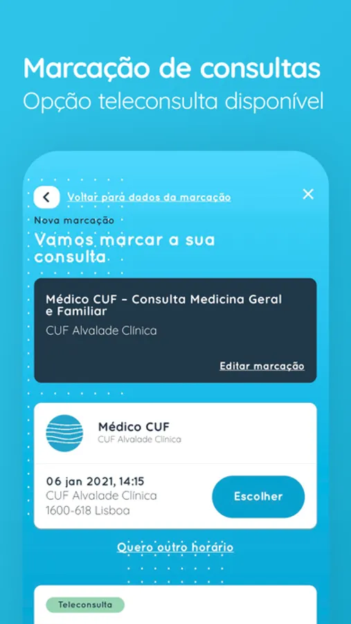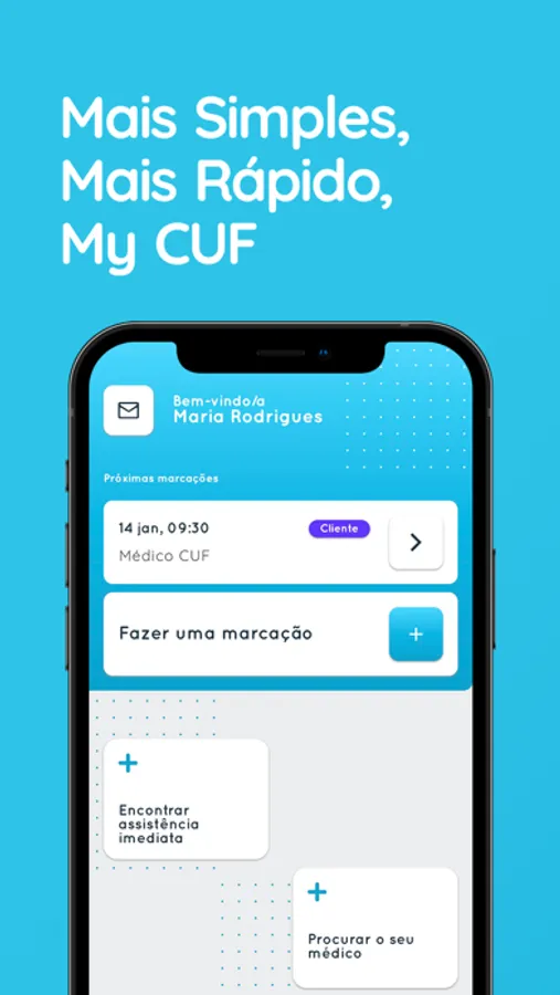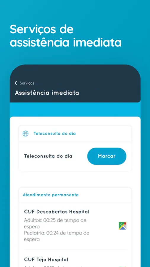 - Aceder de forma rápida a todos os serviços de assistência imediata da CUF - Teleconsulta do Dia, Atendimento Permanente e Consultas sem Marcação