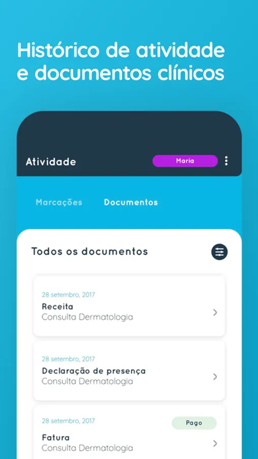 - Consultar a sua atividade passada, acedendo de forma imediata a todos os documentos associados a cada consulta / exame