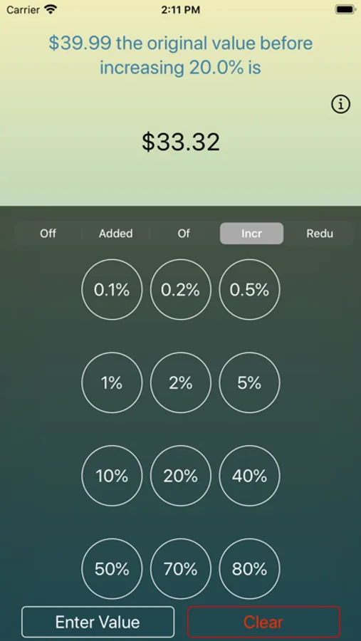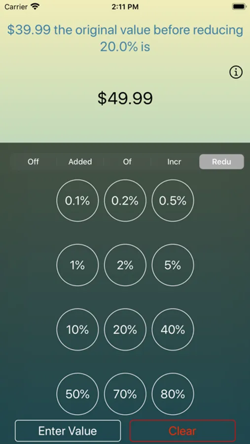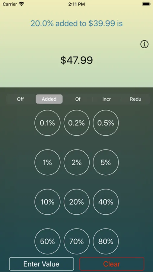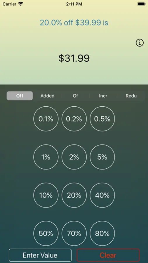 It features large buttons to input values and hot keys to let you select the percentage you want to apply to a figure.