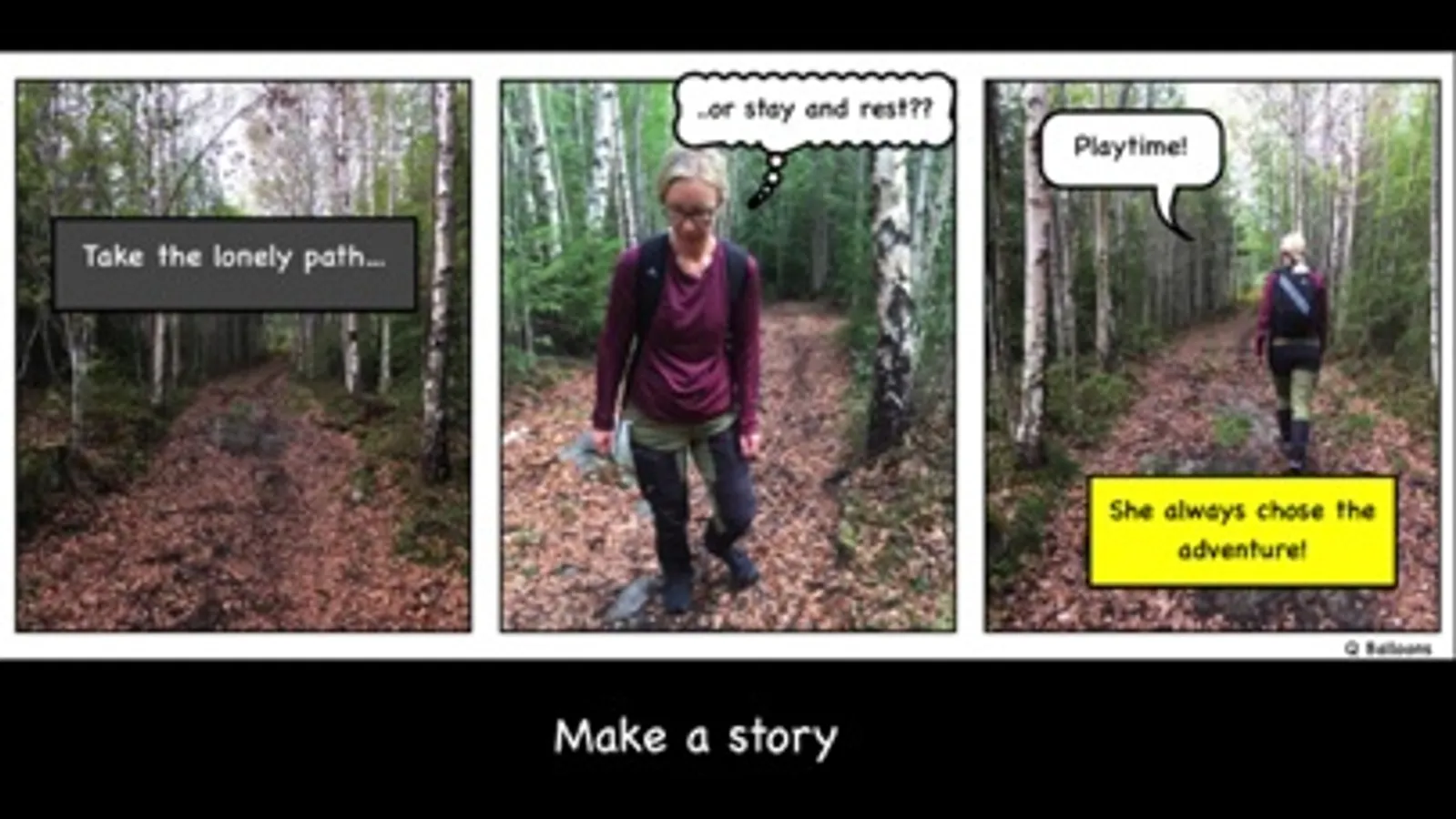 Select your photo or use the camera to take a new one. Add a balloon, adjust size, position and edit your text. Put three frames in a row to make a small story.