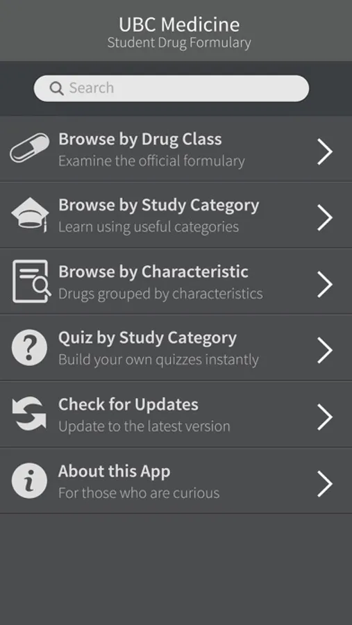 This educational app contains the drug formulary for the University of British Columbia (UBC) medical school. It is intended to assist medical students with learning drugs by providing the drug class, mechanism of action, side effects, dosage, indication, contraindications, pharmacokinetics, monitoring, important notes and alternate names of drugs. The app allows users to make custom-built quizzes and browse through drug reference material. The app auto-updates itself every time it is started and it stores the drug formulary information so that it can be used without internet access. The app was developed through collaboration amongst medical students in the UBC Faculty of Medicine!