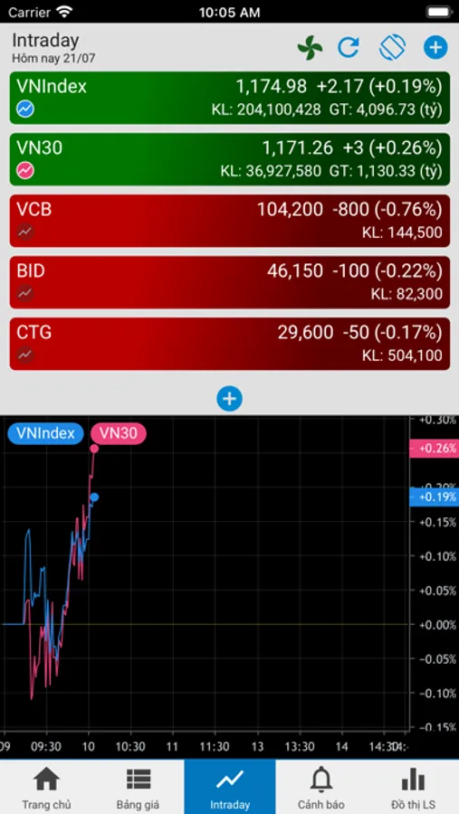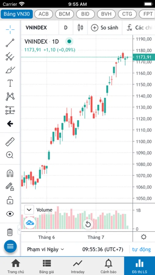 - Đồ thị Intraday, đồ thị PTKT chuyên sâu với đầy đủ các chỉ báo, công cụ vẽ, đánh dấu, ghi nhớ cấu hình đồ thị.