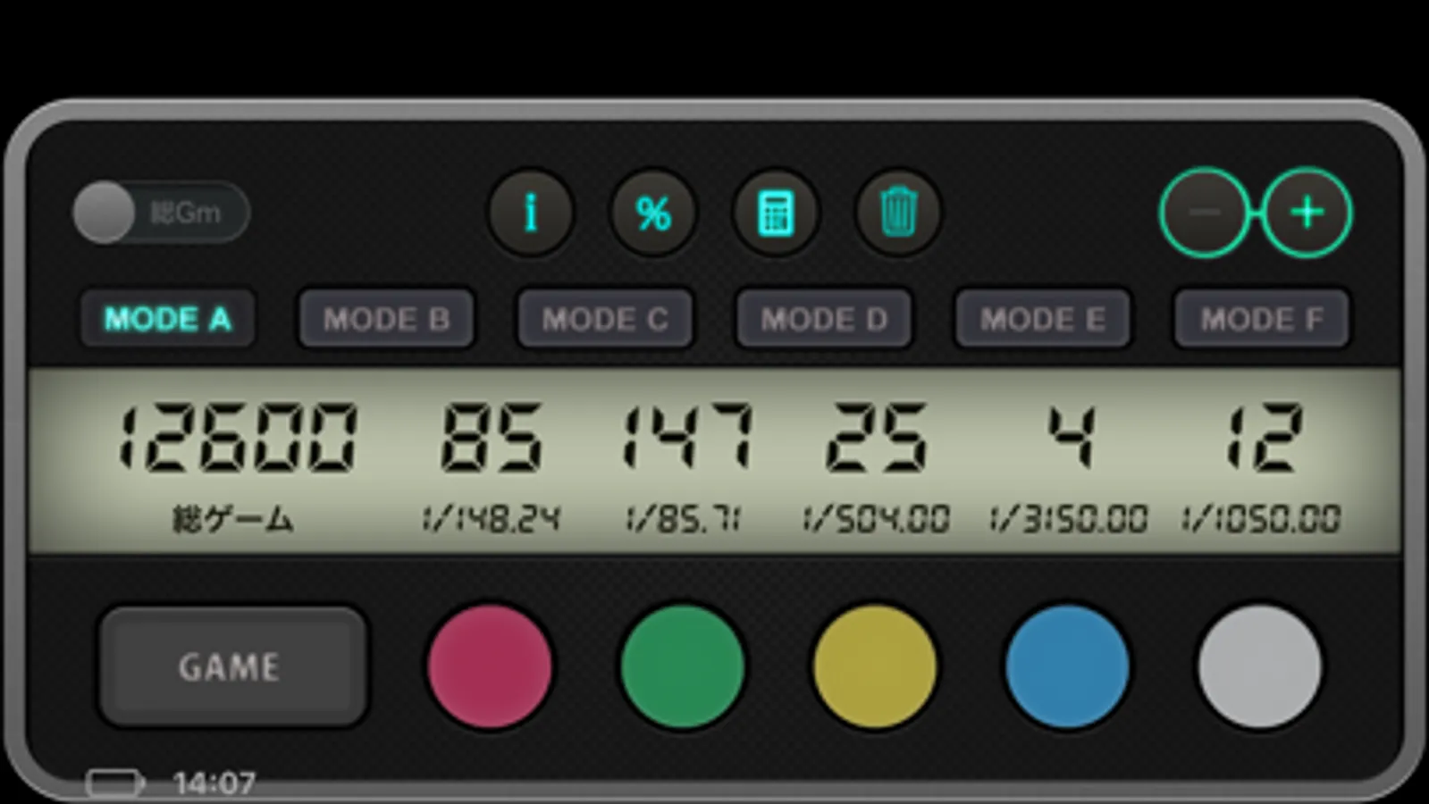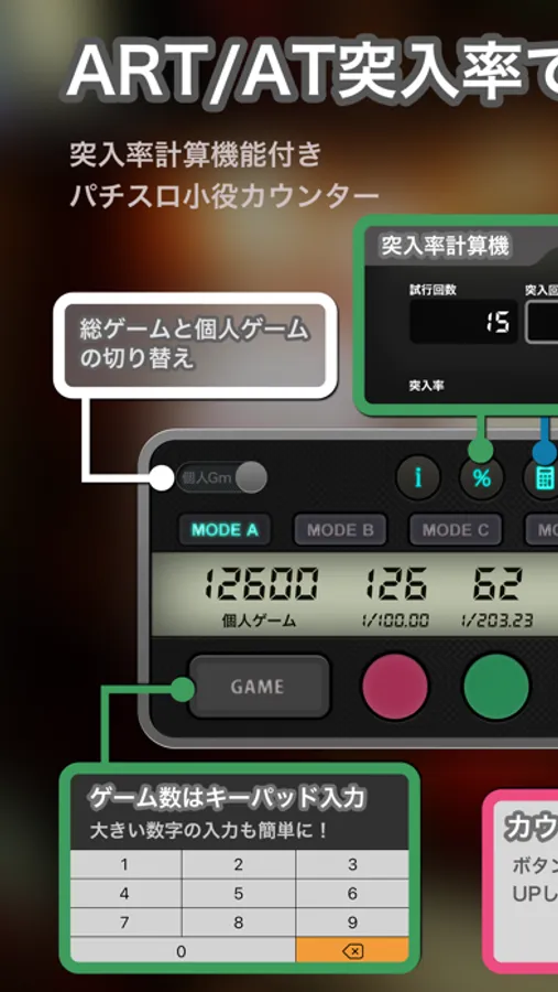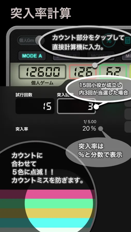 ゲーム数や小役カウント数をタップすることで、直接計算窓に入力できる計算機を搭載。