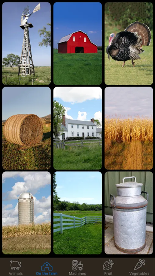 Your kid simply taps on one of the photos and it will be shown in full screen quality and a sound related to the photo will be played. For example: a happy dog barking, the engine noise from the tractor, or the pronunciation of many different fruits and vegetables. Super simple and fun!