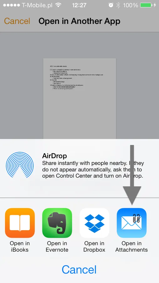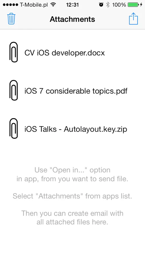 Now you can just export documents as usual from any application, using option "open in..." and select Attachments from apps list. Then again and again... and when your attachment list is complete, then simply tap send and you've got classic email sheet with all listed attachments added.