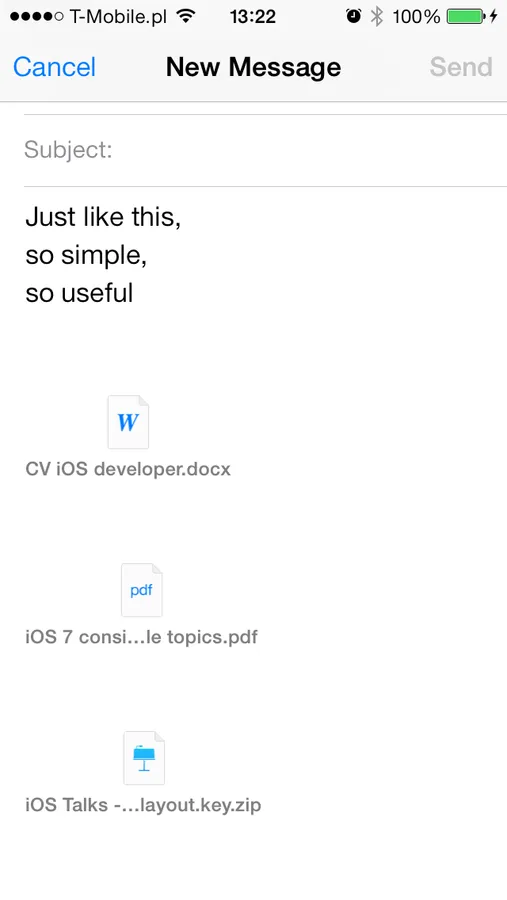 Just works. Without any accounts, without logging into any email (it uses iOS accounts), without sharing anything to cloud services, without problems and headache about sending more than one attachment!