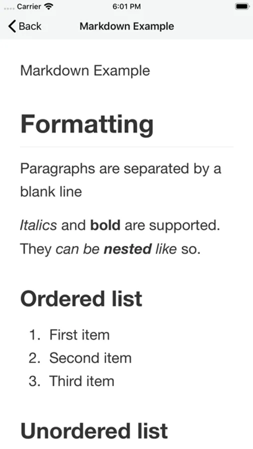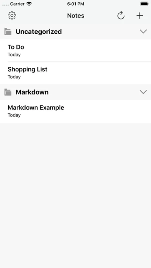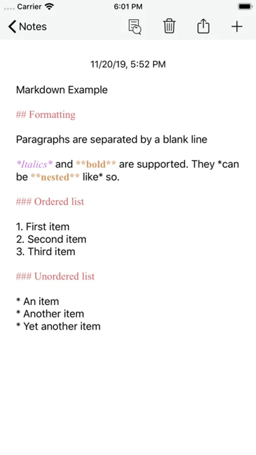 You can create and delete notes directly on the device. Notes can be organized in categories. Edit as plain text or use markdown for rich formatting. Notes can be copied or exported to other apps or services in several formats.