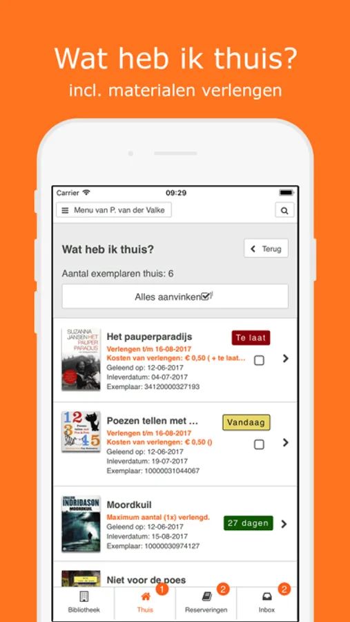 + Wat heb ik thuis? In één oogopslag ziet u wat u aan materialen thuis heeft én wanneer dit weer ingeleverd moet worden. Direct verlengen is mogelijk: zowel de eigen exemplaren als die van gezinsleden. Wel eerst de machtiging(en) voor verlengen instellen!