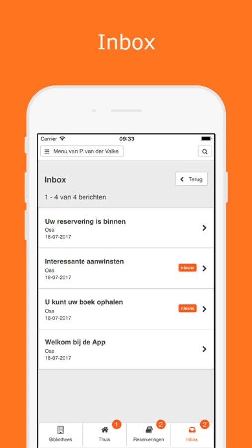 + Inbox en push-berichten houden u op de hoogte van de laatste stand van zaken. Reserveringen ophalen? Materialen inleveren? De bibliotheek laat het u weten. Zorg er wel voor dat u aangemeld bent en blijft.