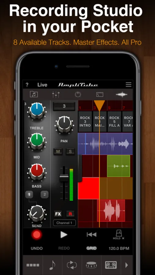 • Two-track recorder (with re-amping) expands to 8-track studio via in-app purchase