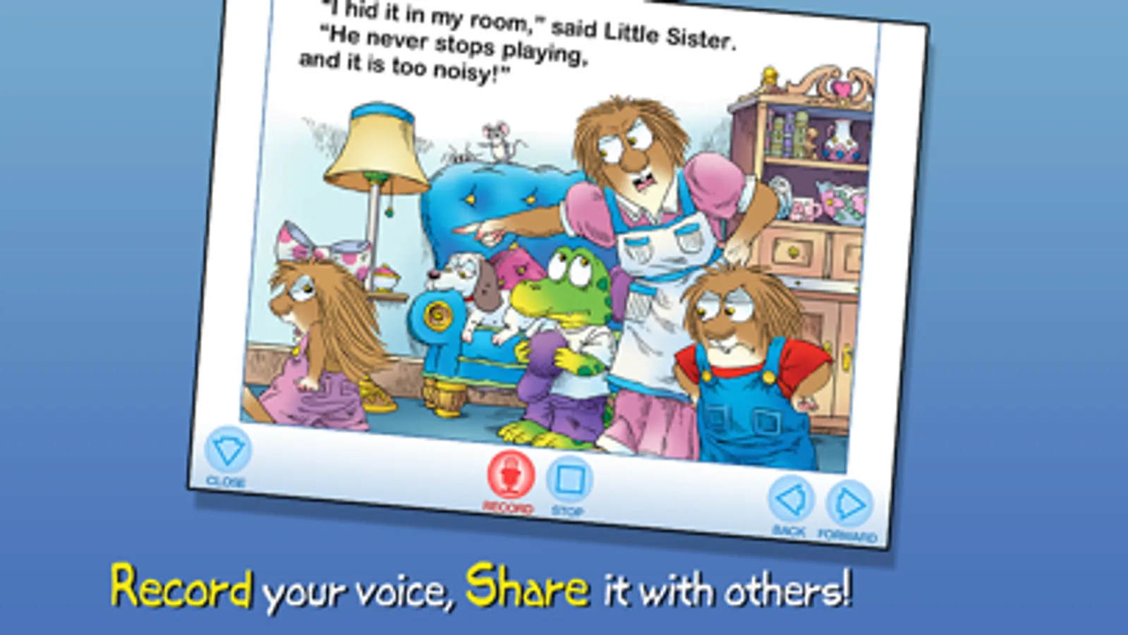 Join Little Critter in this interactive book app as he gets a new musical hobby… and it’s noisy! Watch as he is so excited about his new drums that he play them everywhere. Explore pictures, learn new vocabulary, and personalize the story with your own narration. How will Little Critter realize that he might need just a few more lessons before he's ready for his own rock-and-roll band?
