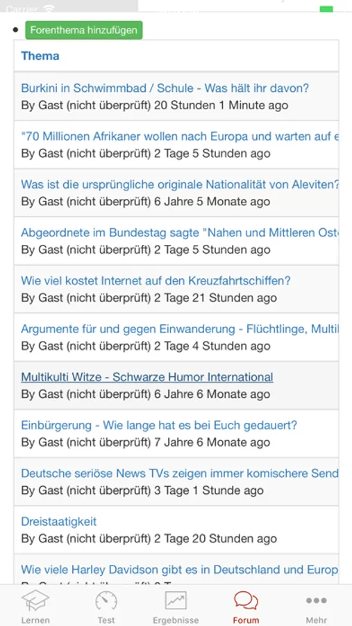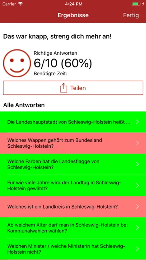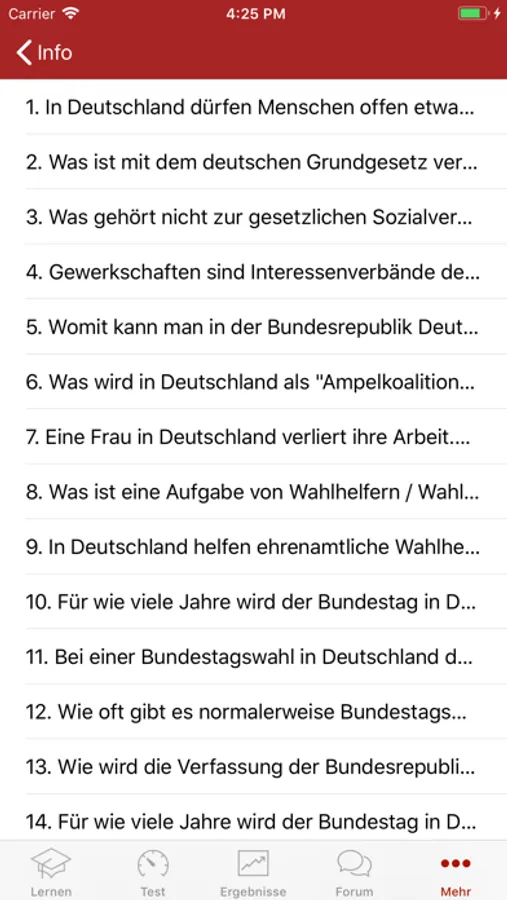 Du kannst alle Fragen nacheinander lernen oder im Test Modus die Prüfung so wie der offizielle Einbürgerungstest durchführen.