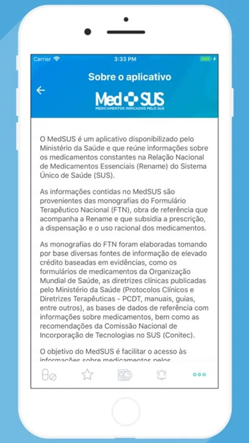 O MedSUS é um aplicativo disponibilizado pelo Ministério da Saúde e que reúne informações sobre os medicamentos constantes na Relação Nacional de Medicamentos Essenciais (Rename) do Sistema Único de Saúde (SUS).