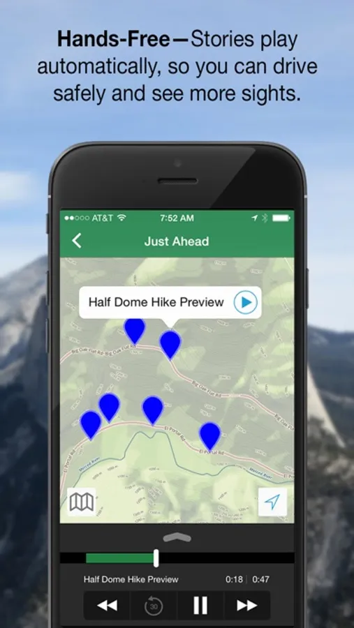 Just Ahead audio tour guides play automatically. Just turn on the app and begin driving—it talks whenever there’s something informative or entertaining to say!
