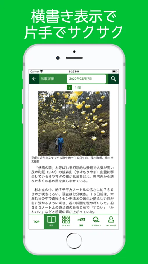 新聞同様のページ別に加えて、興味のある記事を見つけやすいよう、ジャンル別や地域別でも記事を探すことも可能。過去30日分のバックナンバーを読むことができます。