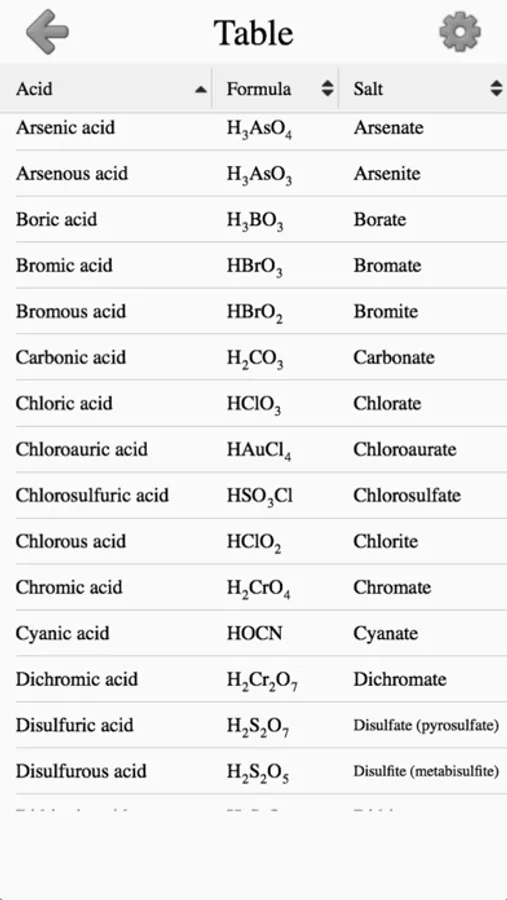 Learn names and formulas of all important inorganic acids, polyatomic ions and their salts. An app is suitable for everyone: from high school students to chemistry professors.