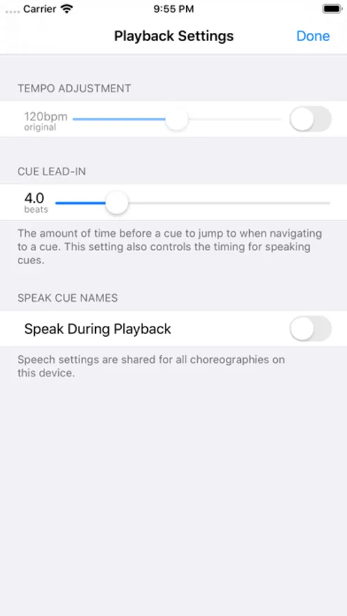 To help you memorize a choreography, DanceMaster can speak your cue names during playback, so you don't need to look at the screen or your notes while you rehearse.