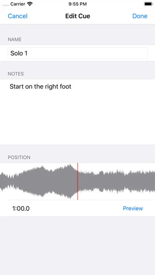 DanceMaster allows you to set cues in the music that you can easily jump to at any time. In addition, you can add a configurable lead-in time to all cues in a choreography. The lead-in time sets the jump point for each cue a little before the actual cue time, giving you time to count in, but keeping your cue marks where they should be.