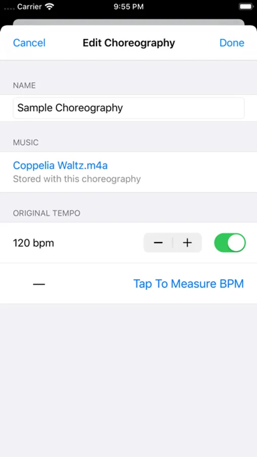 If you supply the original tempo for a piece of music (either via the "BPM" field in iTunes, or by setting it directly in the app), DanceMaster will show you tempo adjustments and cue lead-ins in beats instead of seconds.